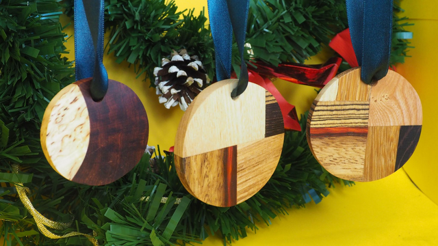 Boule de Noël artisanale en bois (chutes de bois précieux et bois de récupération), fabriqué à la main dans les Vosges. Chaque pièce est unique !